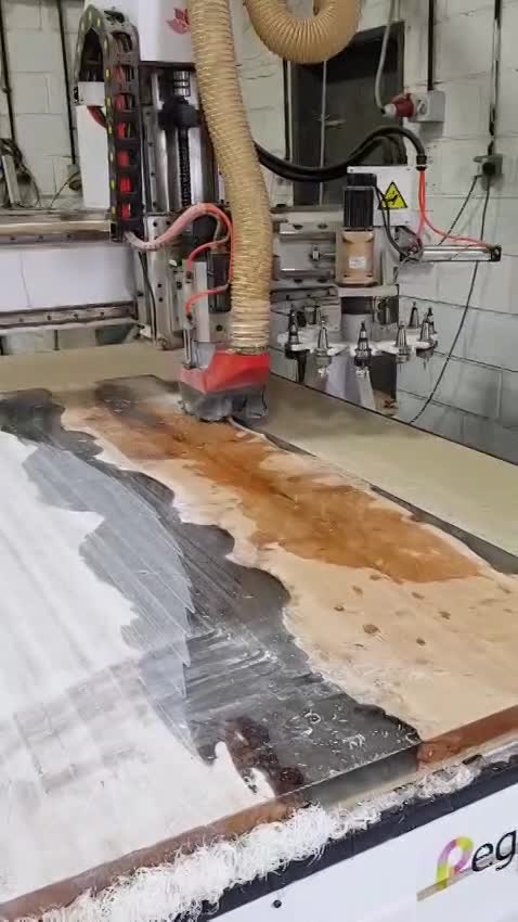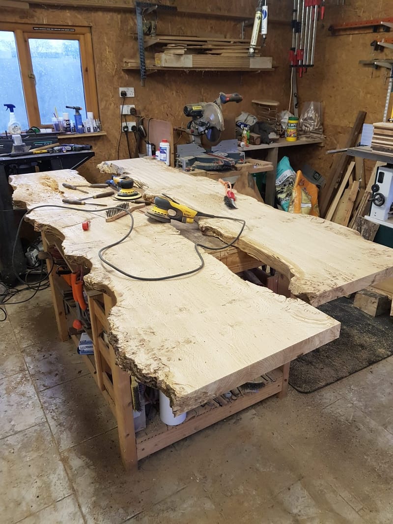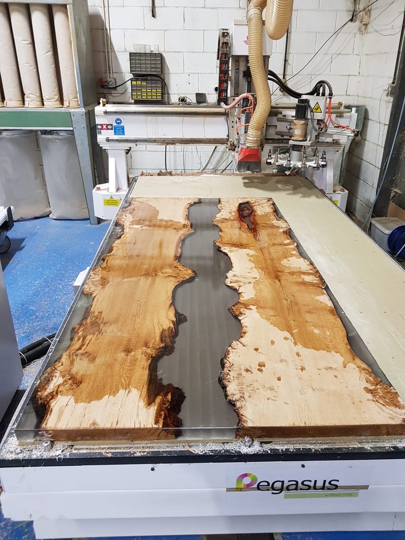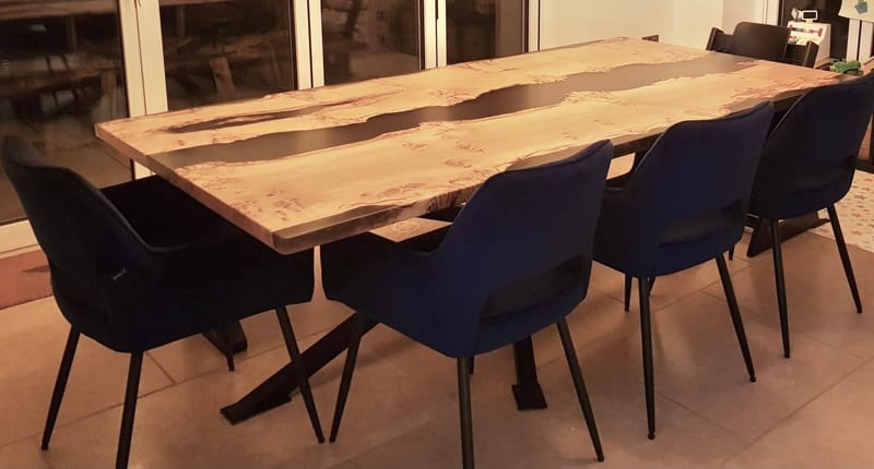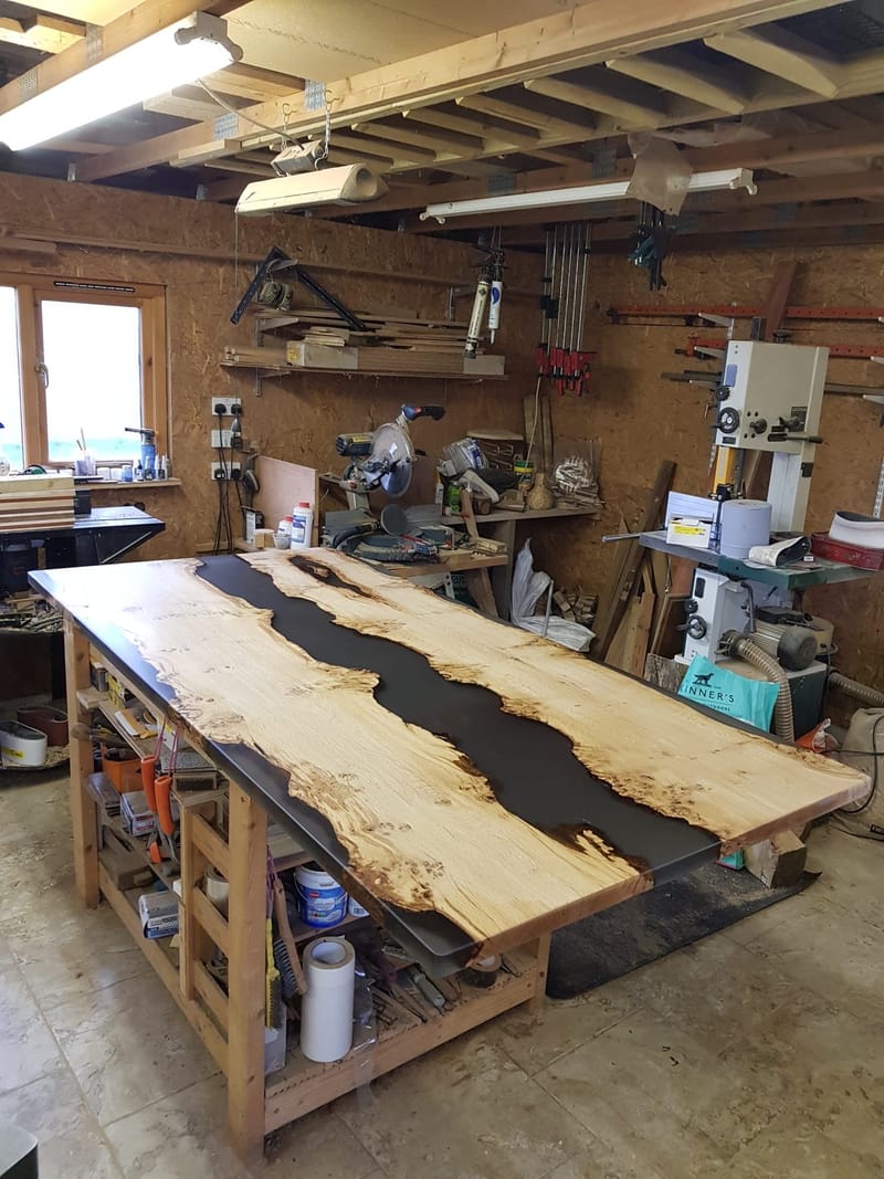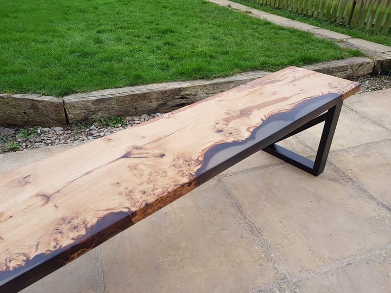 AME made this burr oak resin table from scratch, below you can see the process and the end result. There are also two seats to go along with the table.