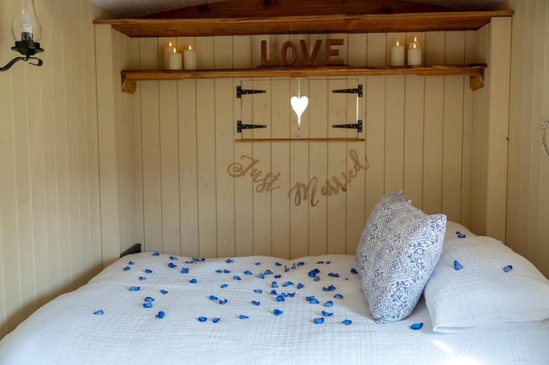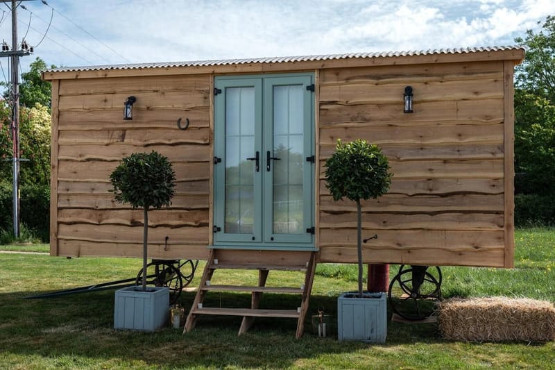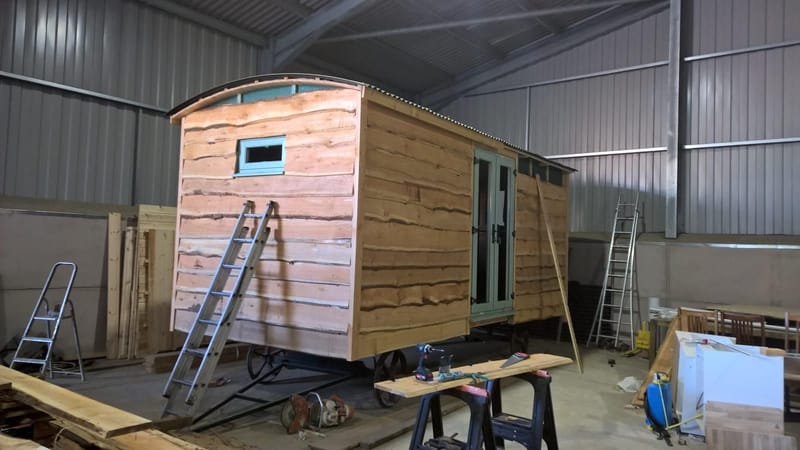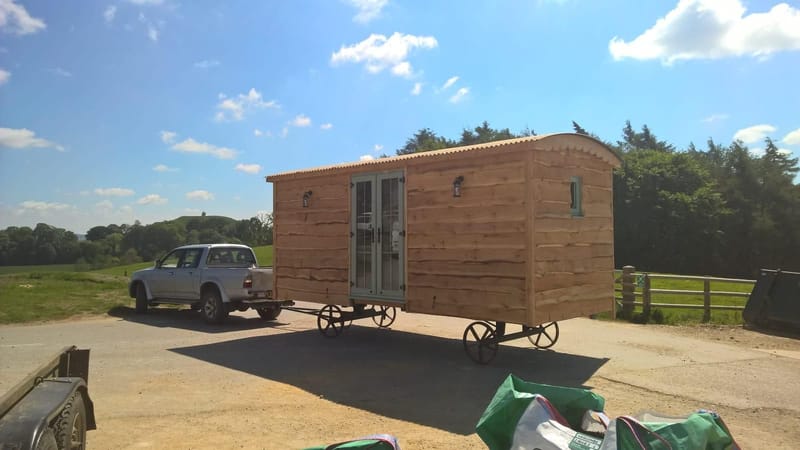 Below is a shepard’s hut made by hand. It’s been built on wheels for transportation and has a bed inside.